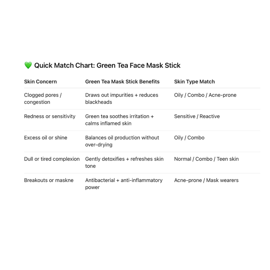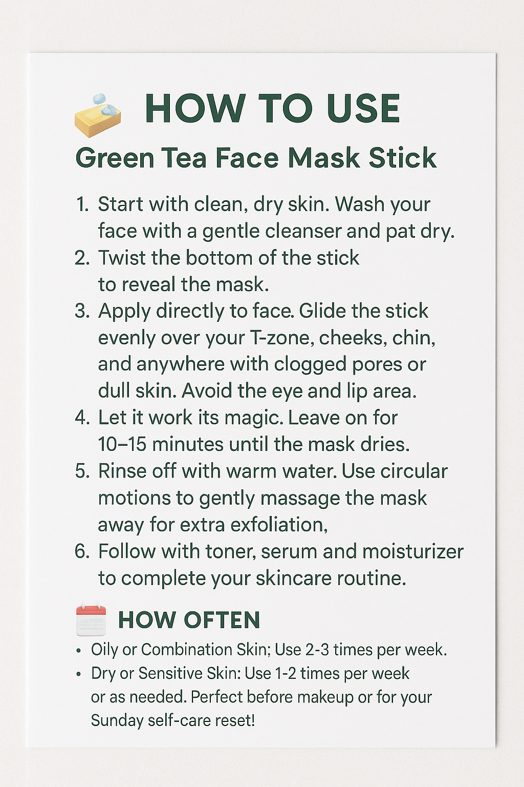 Experience the revitalizing power of green tea in an innovative, no‑mess stick that simplifies your skincare ritual. Whether you’re pressed for time, on the road, or simply seeking a quick skin reset at home, our Green Tea Face Mask Stick has you covered—delivering visible clarity, hydration, and a balanced, radiant glow with every swipe.